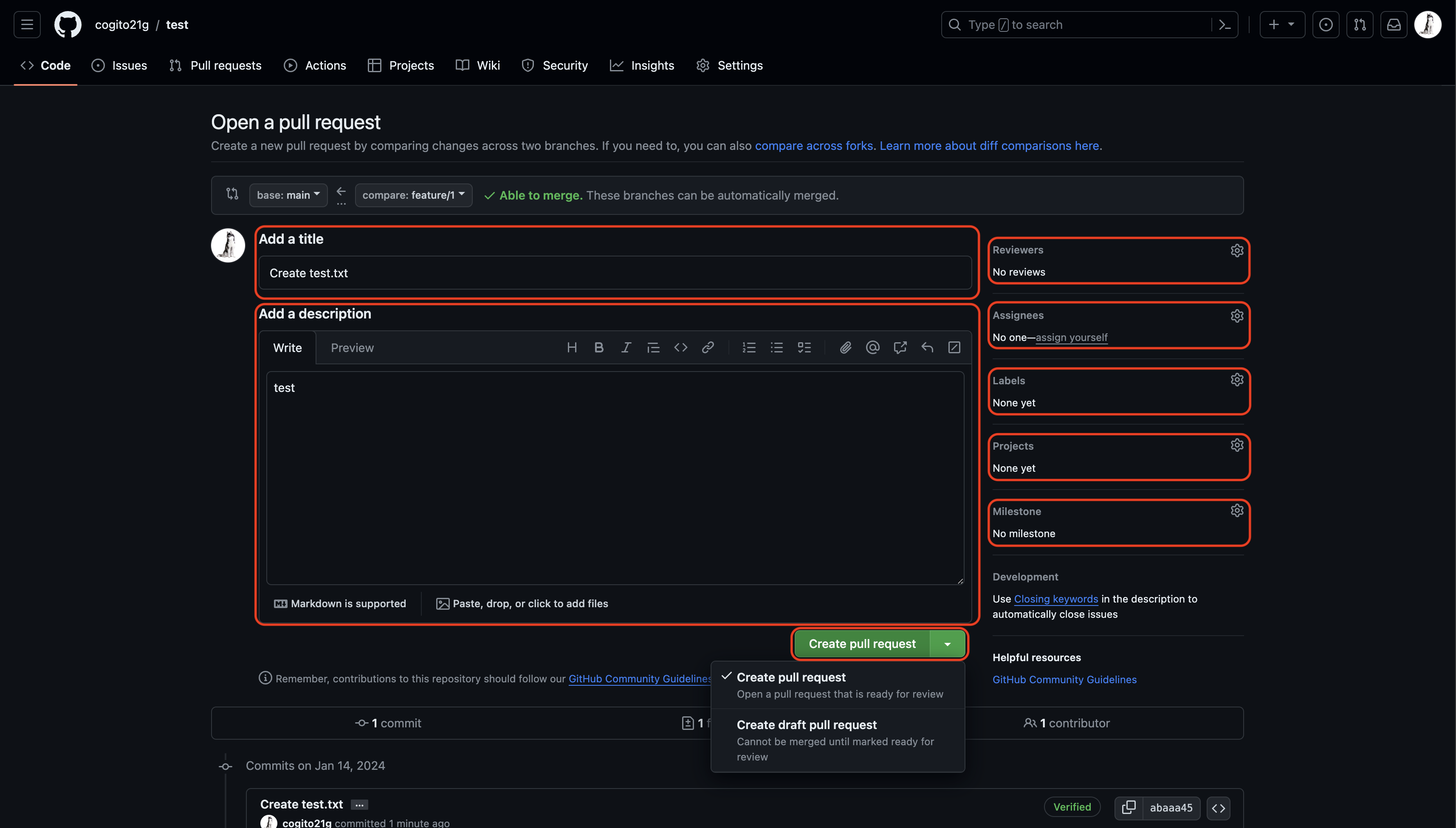 3. 내용 입력 후 Create pull request 클릭