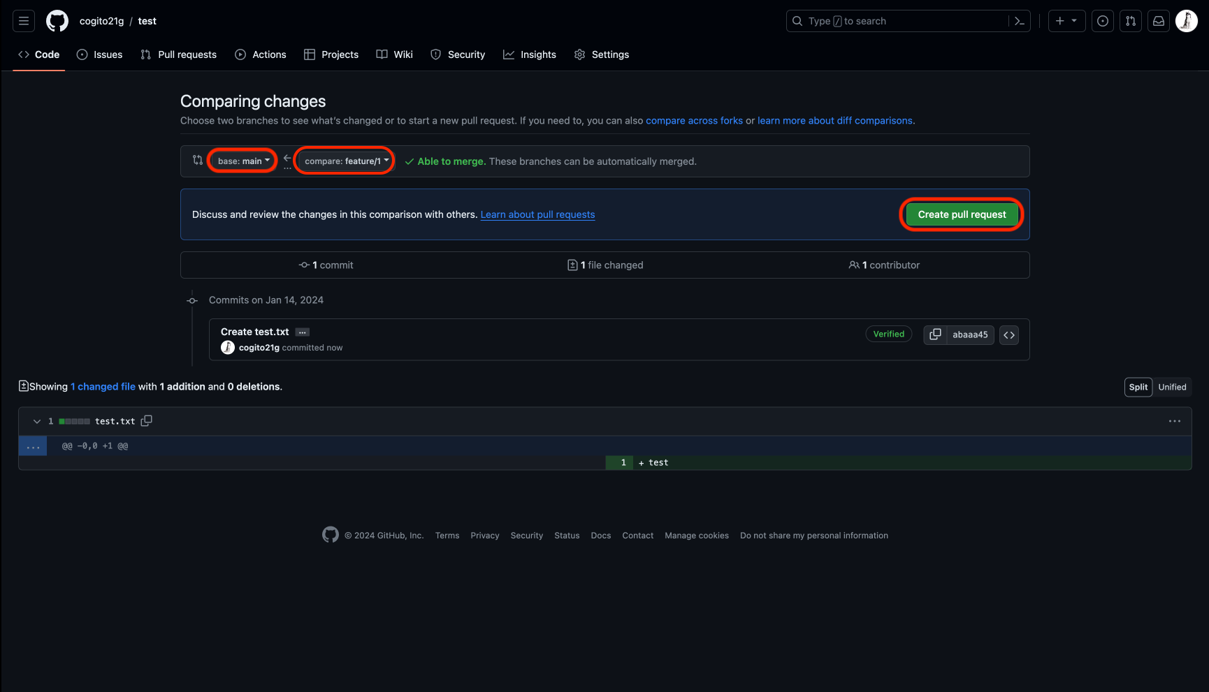 2. compare에서 base로 branch 병합 설정후 Createe pull request 클릭