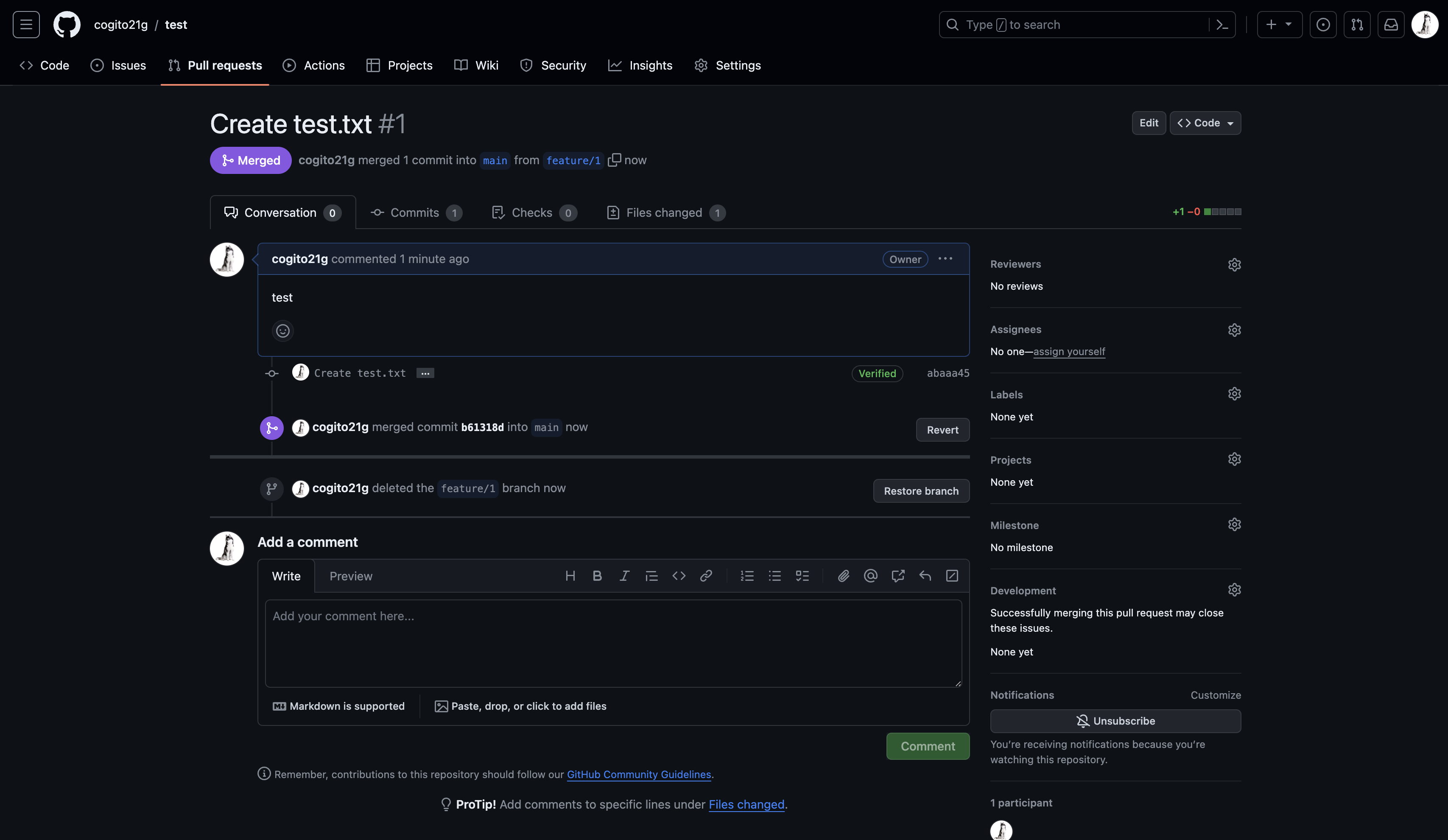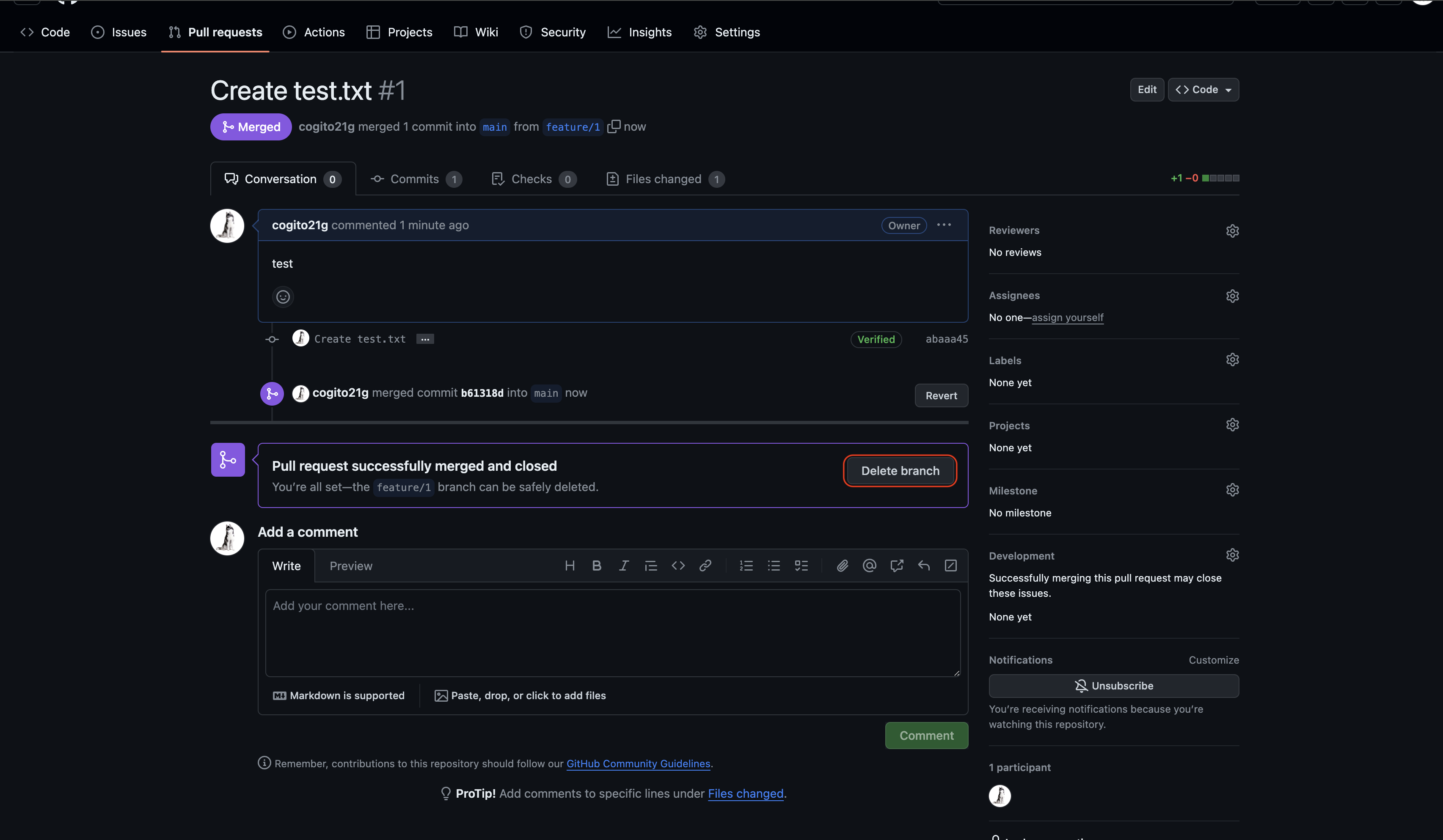 8. merge 여부 확인 및 branch 삭제 확인