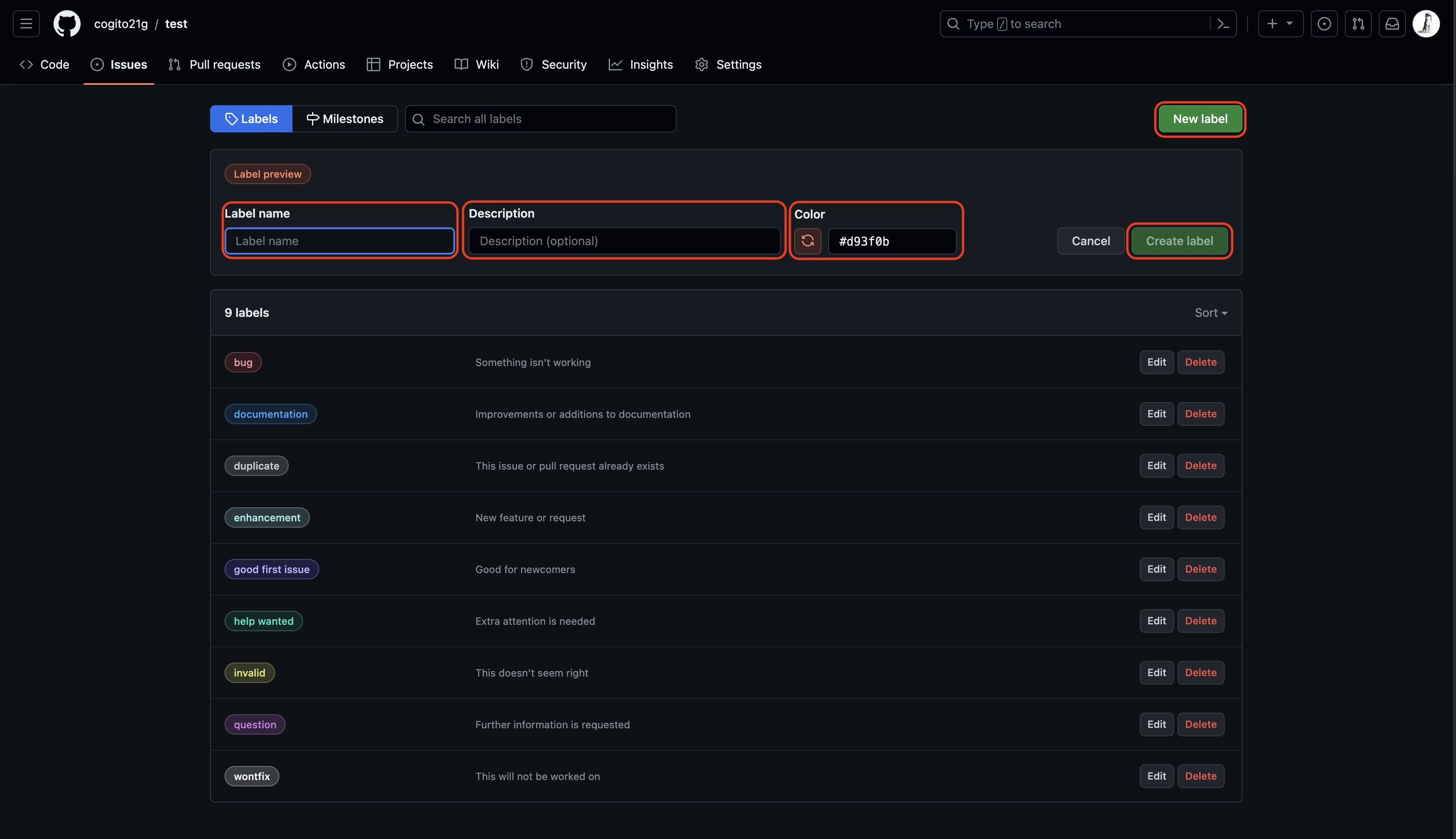- New label 클릭 -> Label name, Description, Color 입력 후 Create lable 클릭