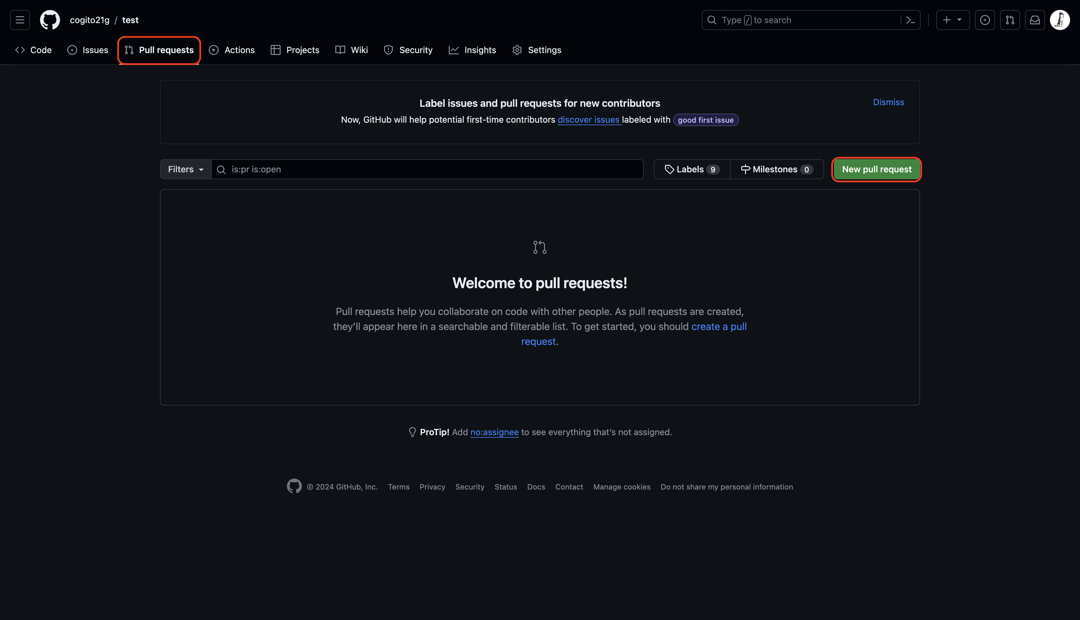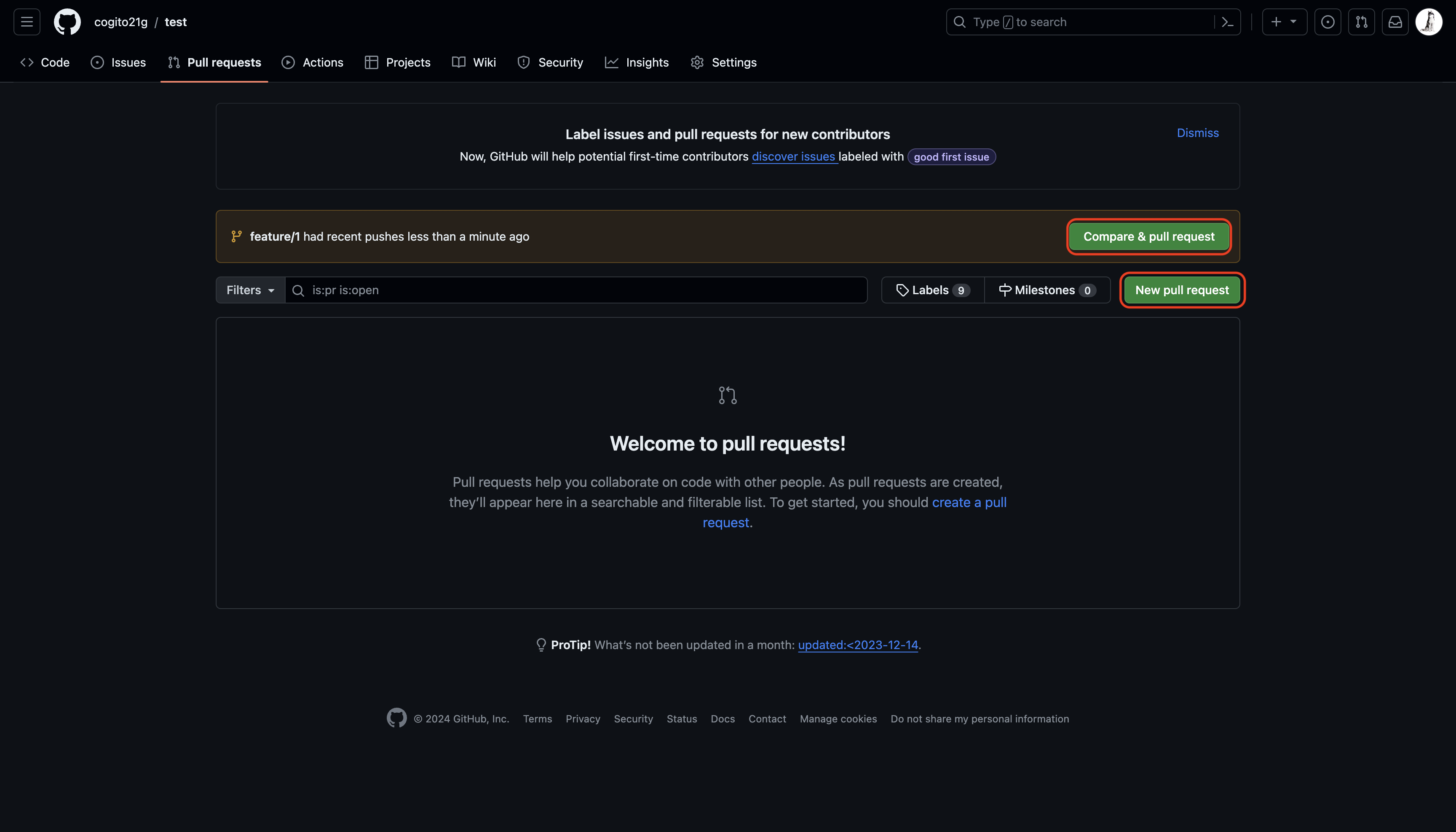 1. Remote Repository의 Pull requests 탭 클릭 후 New pull request 클릭