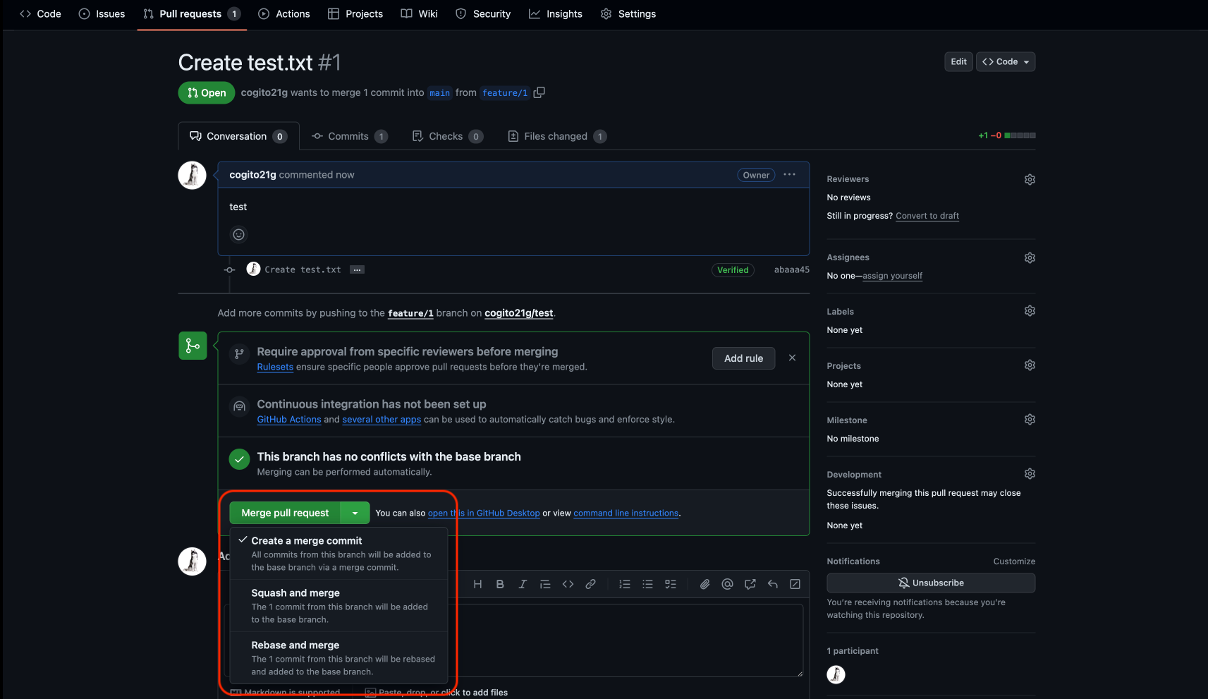 - merge할 branch 가 없으면 좌측 하단의 이미지와 같이 나타남