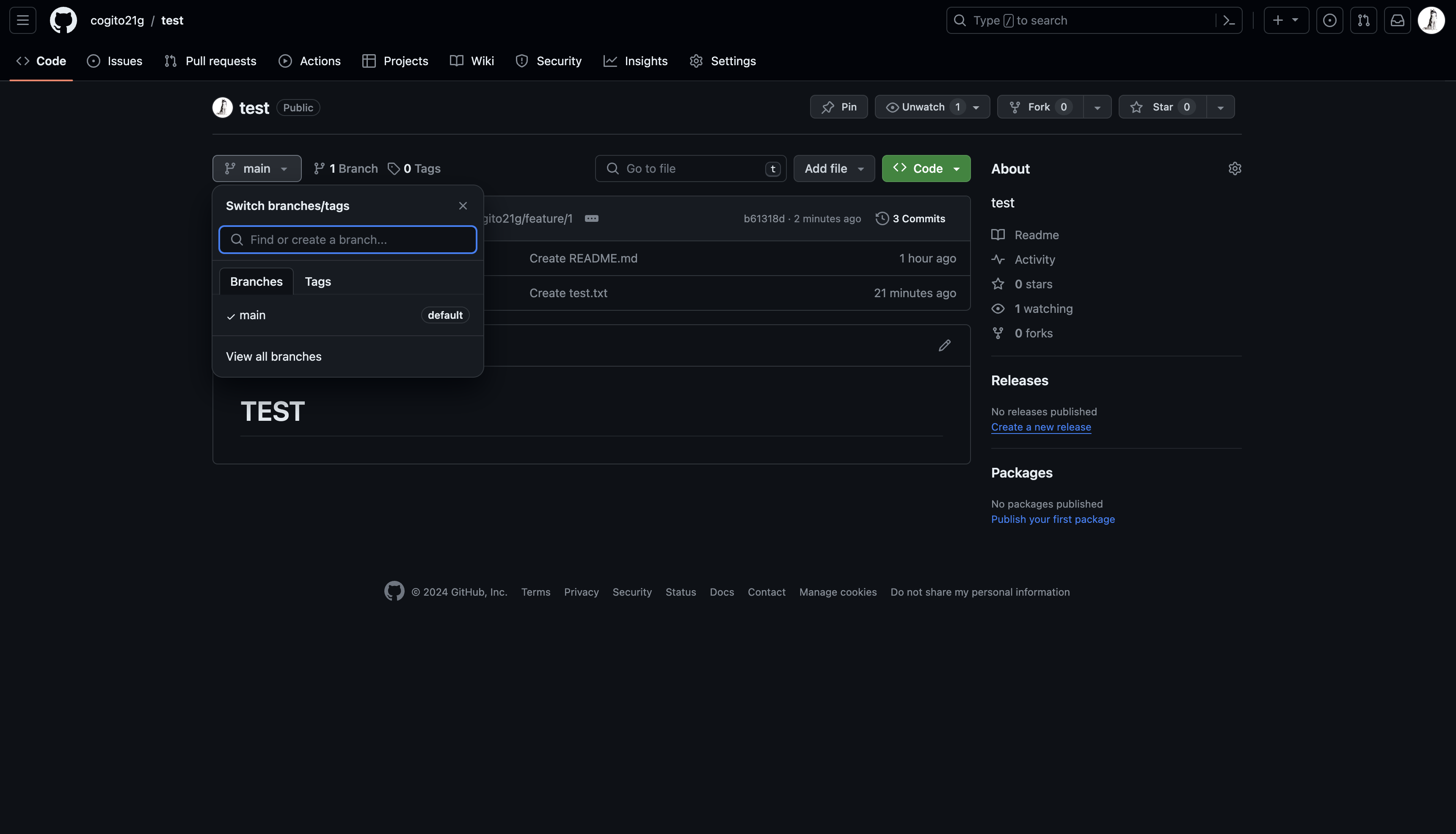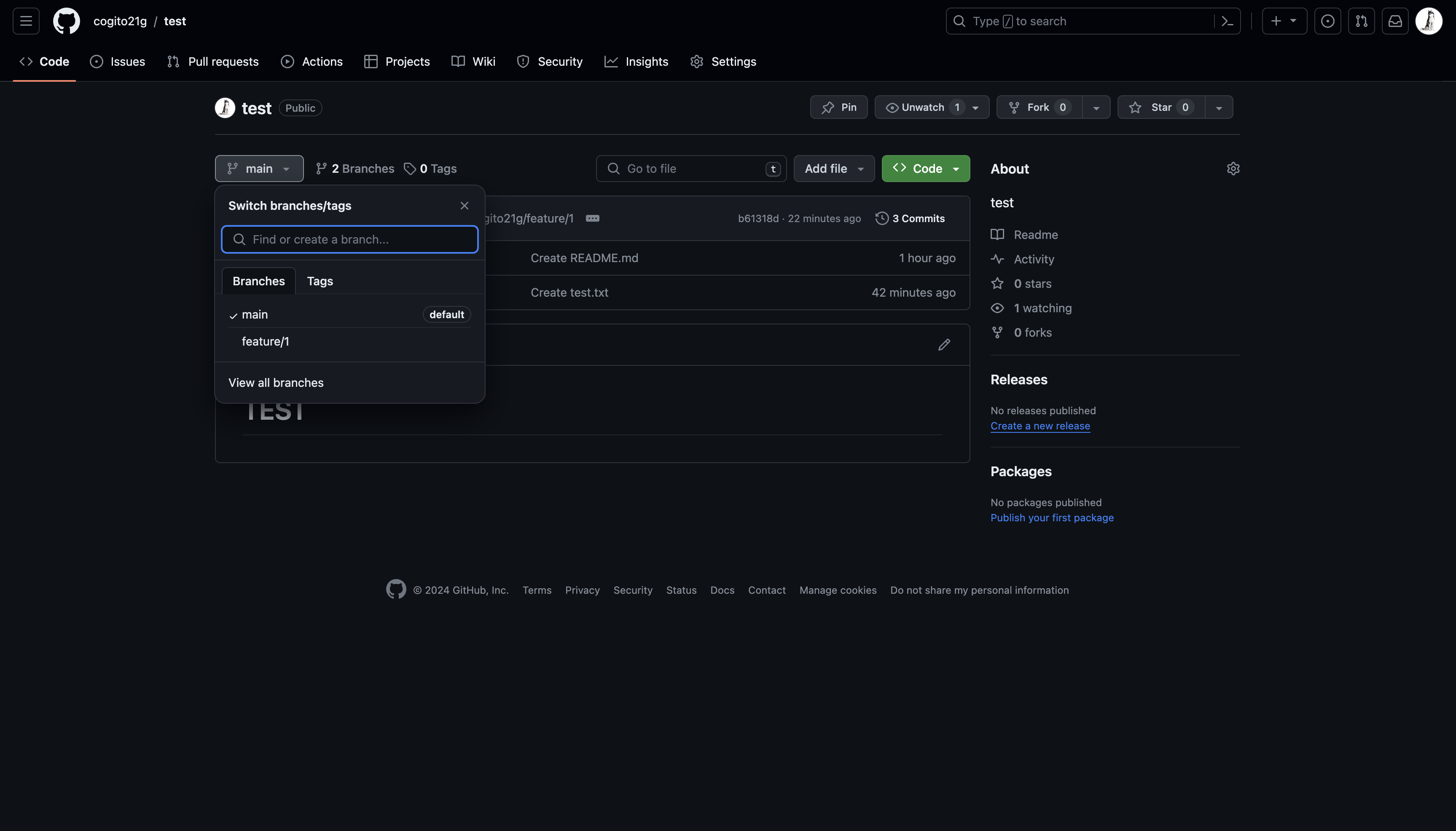 - merge할 branch가 있다면 Compare & pull request가 보임