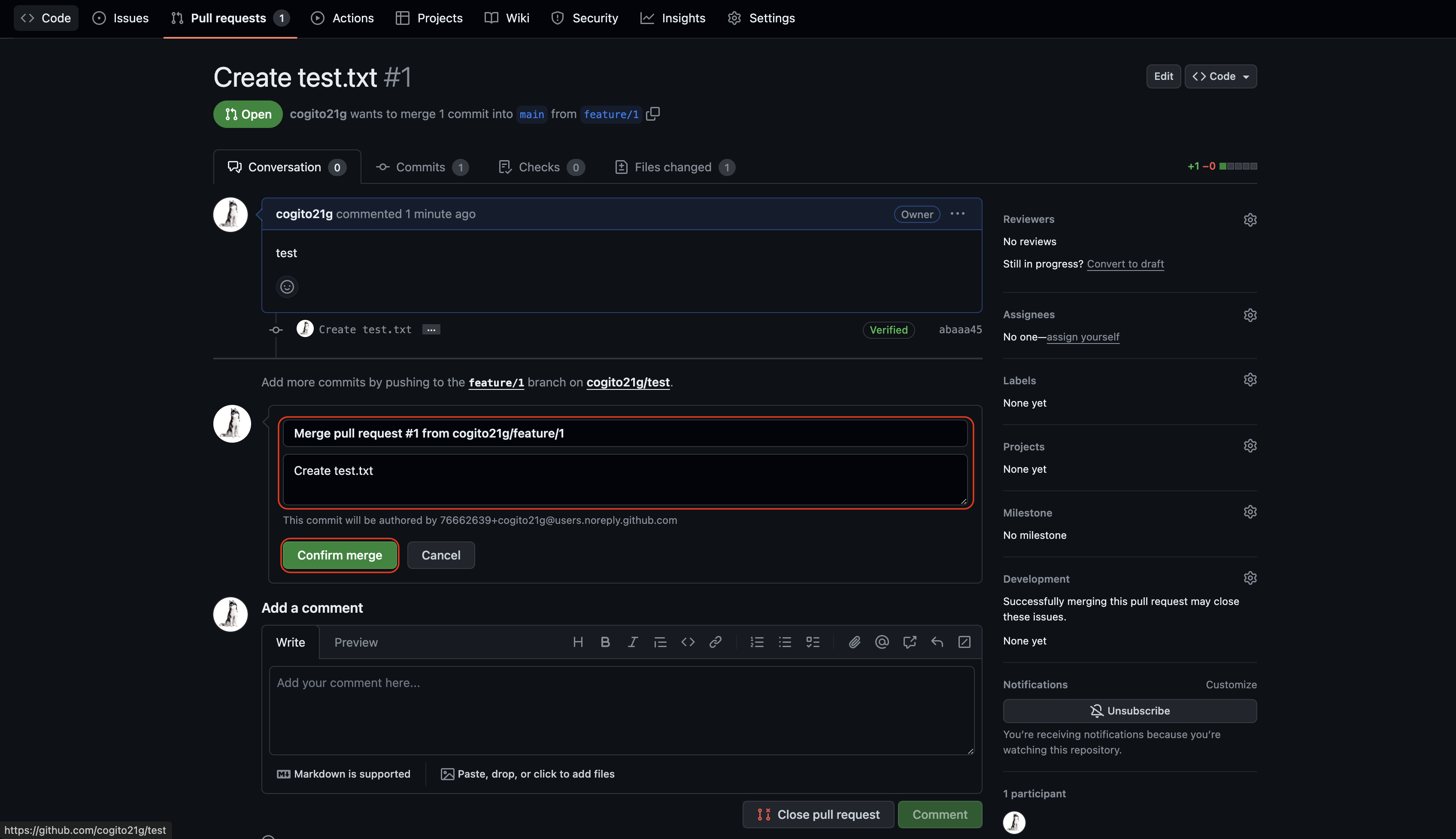 6. Message 입력 후 Confirm merege 클릭