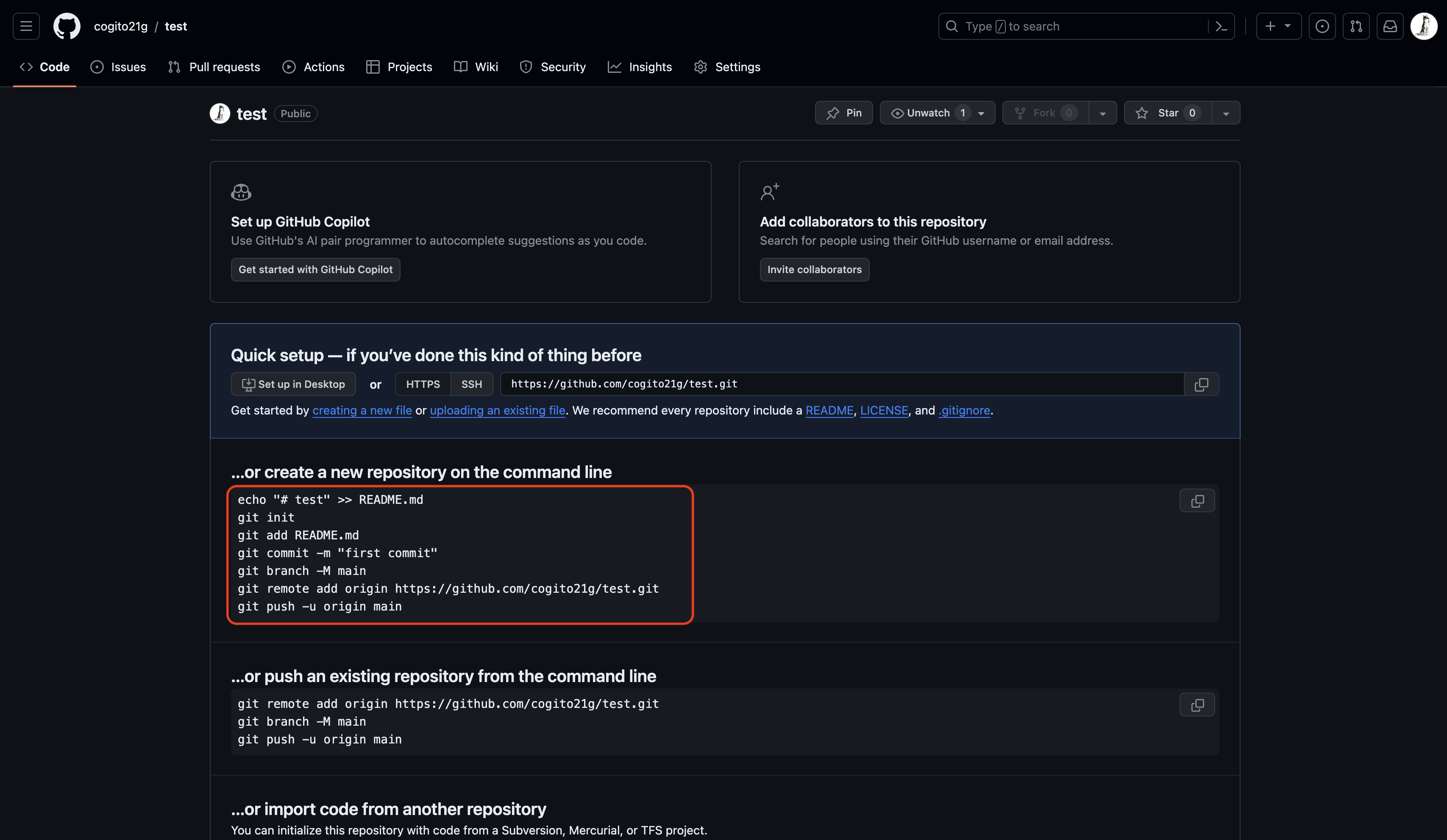 - echo "# test" >> README.md : 파일이 없다면 "# test"를 입력한 README.md 파일 생성.