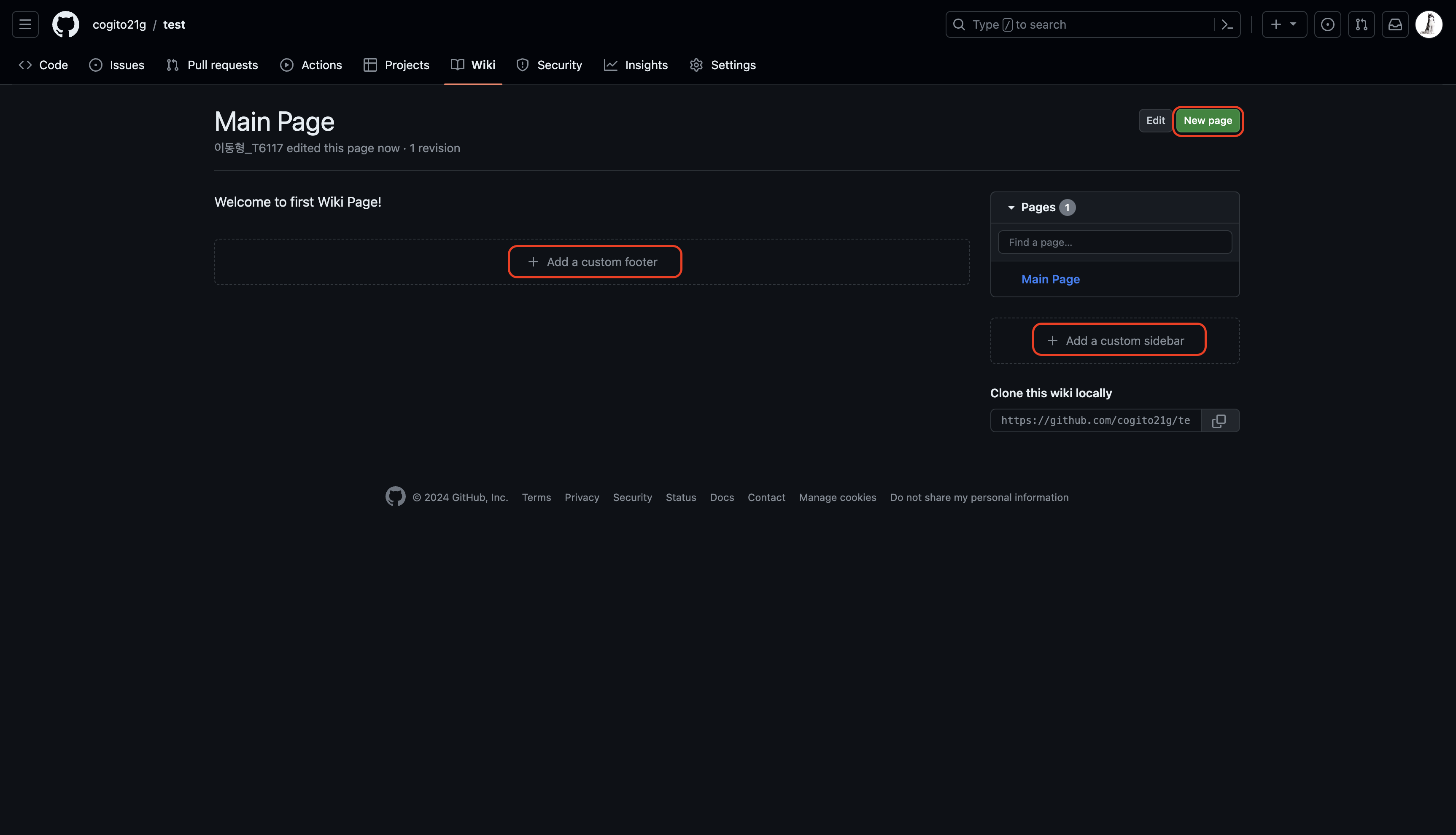 1. Remote Repository 내의 Wiki 탭 선택 후 Create the first page