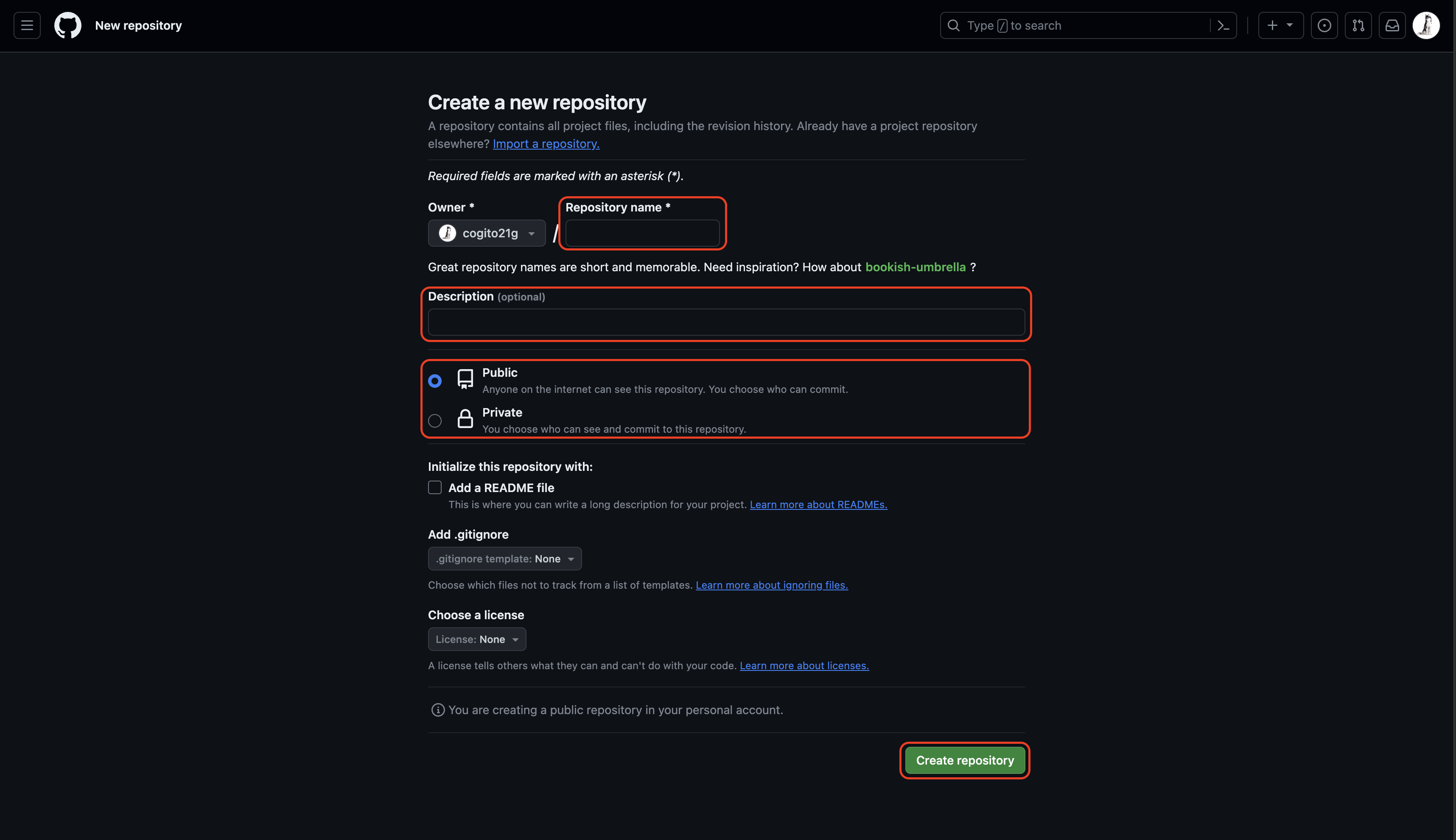 2. Repository 생성 페이지 입력 후 Create repository 버튼 클릭