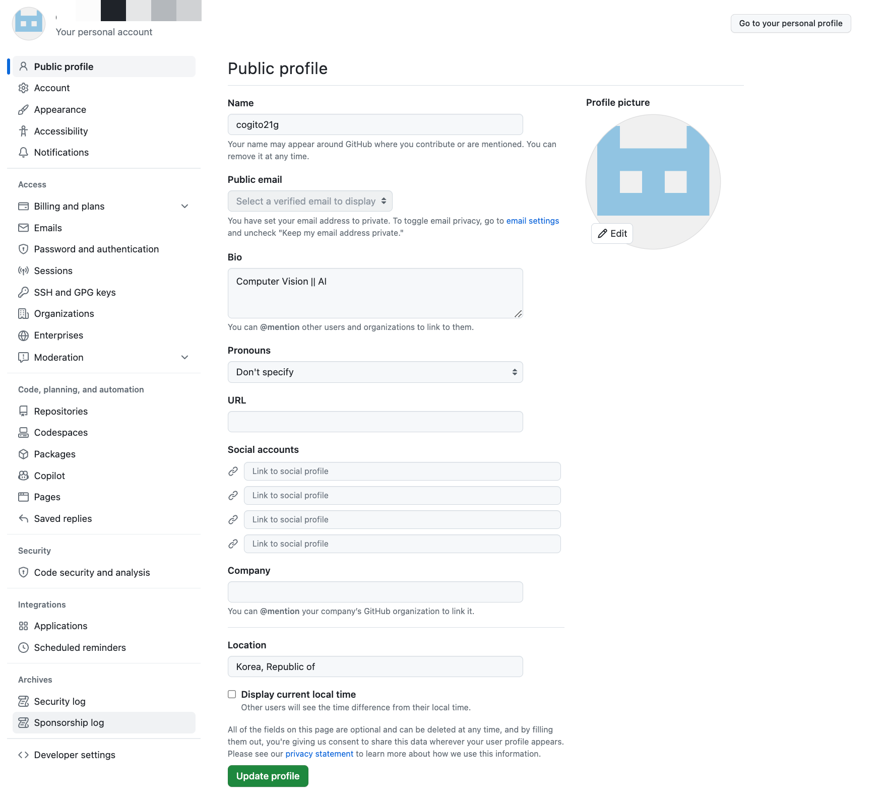 - b) 좌측 탭의 SSH and GPG keys 탭 선택