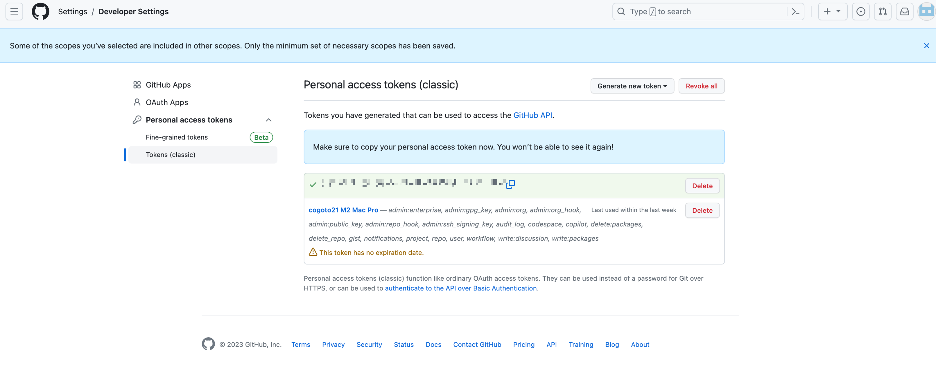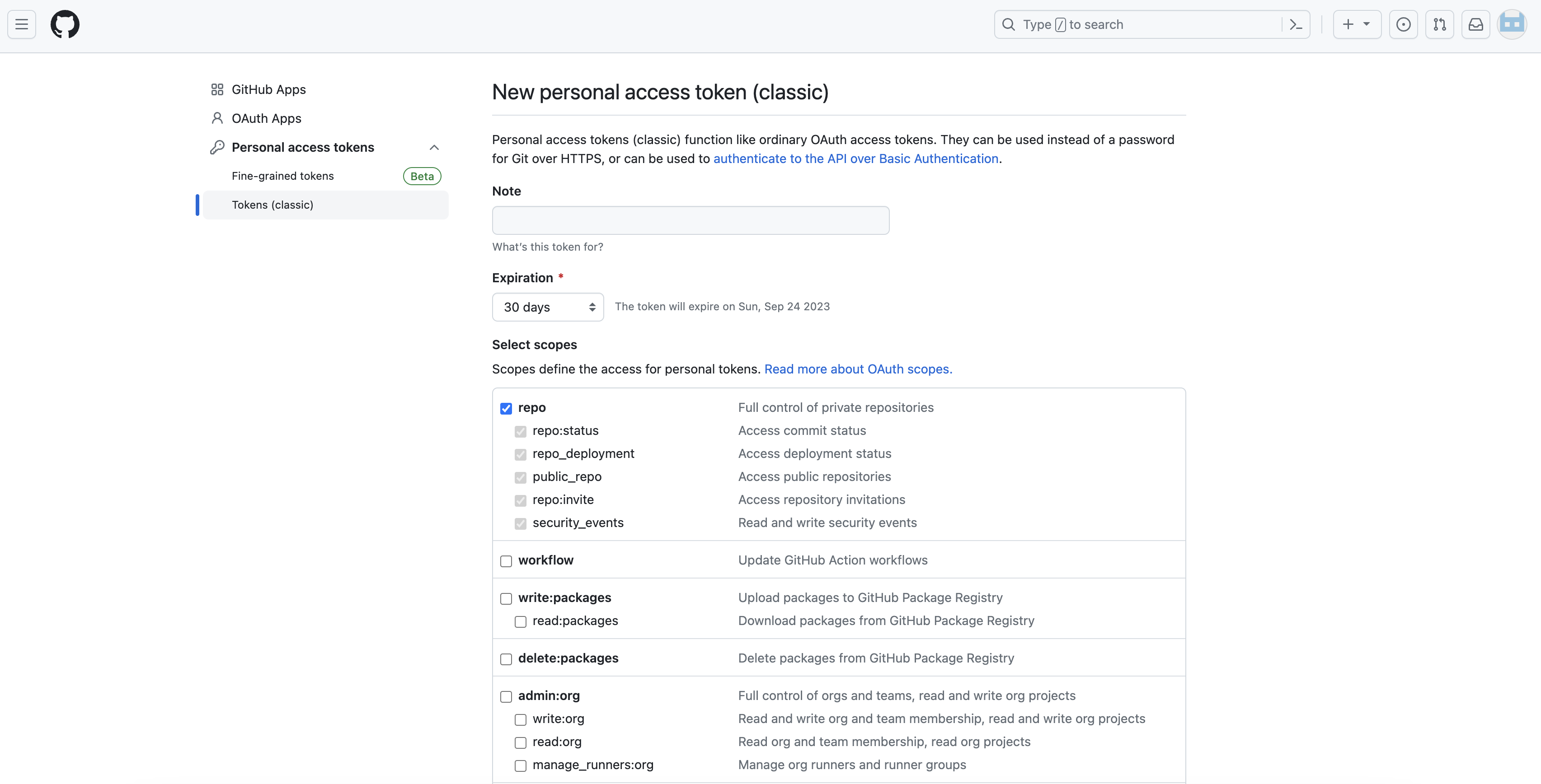 4) Note에 이름 입력후 Expiration(만료 기간) 선택 후 Select scopes에서 원하는 권한 선택 후 create token으로 토큰 생성