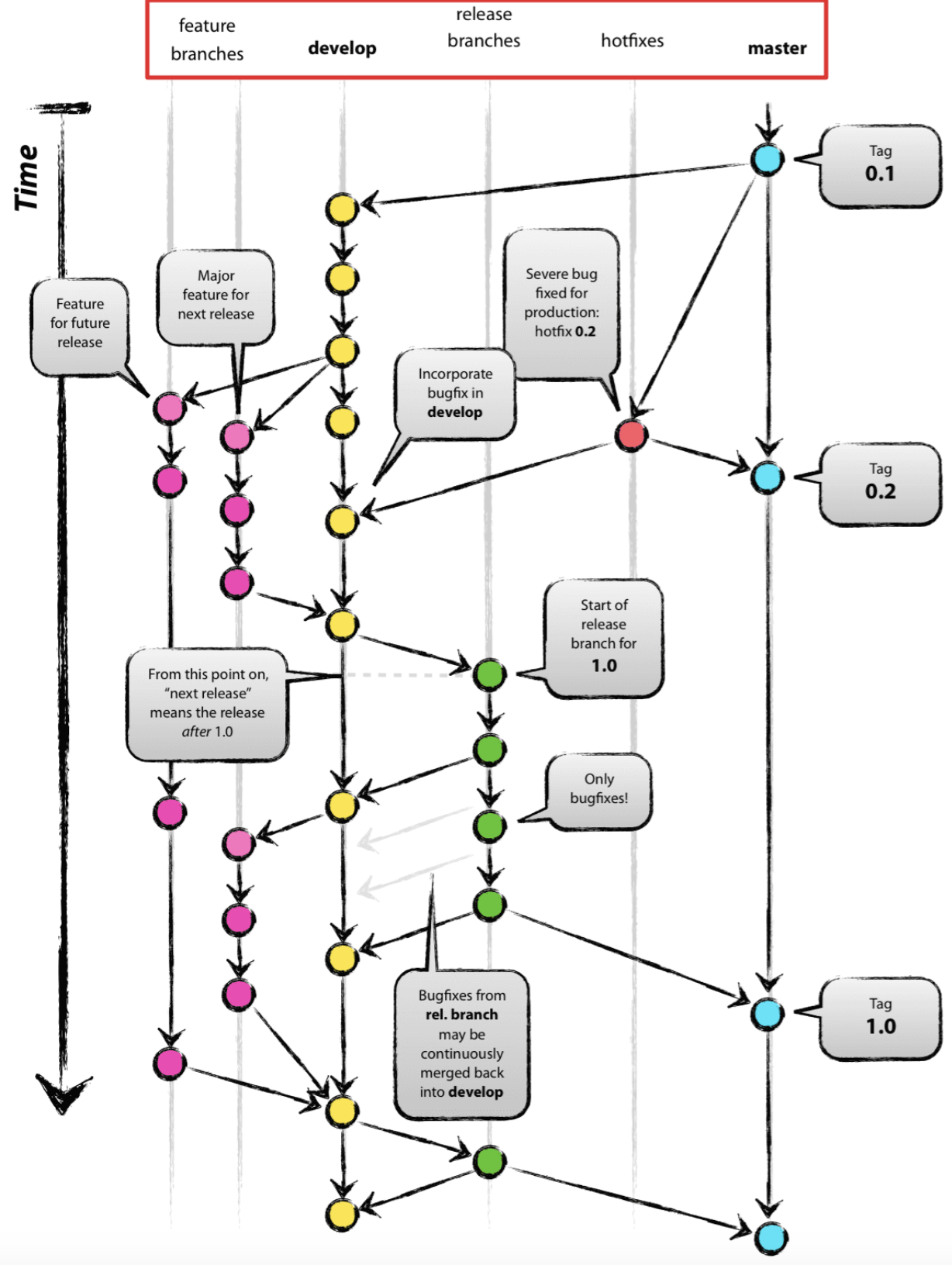 - 개발자들은 develop 브랜치에 자유롭게 커밋을 합니다.