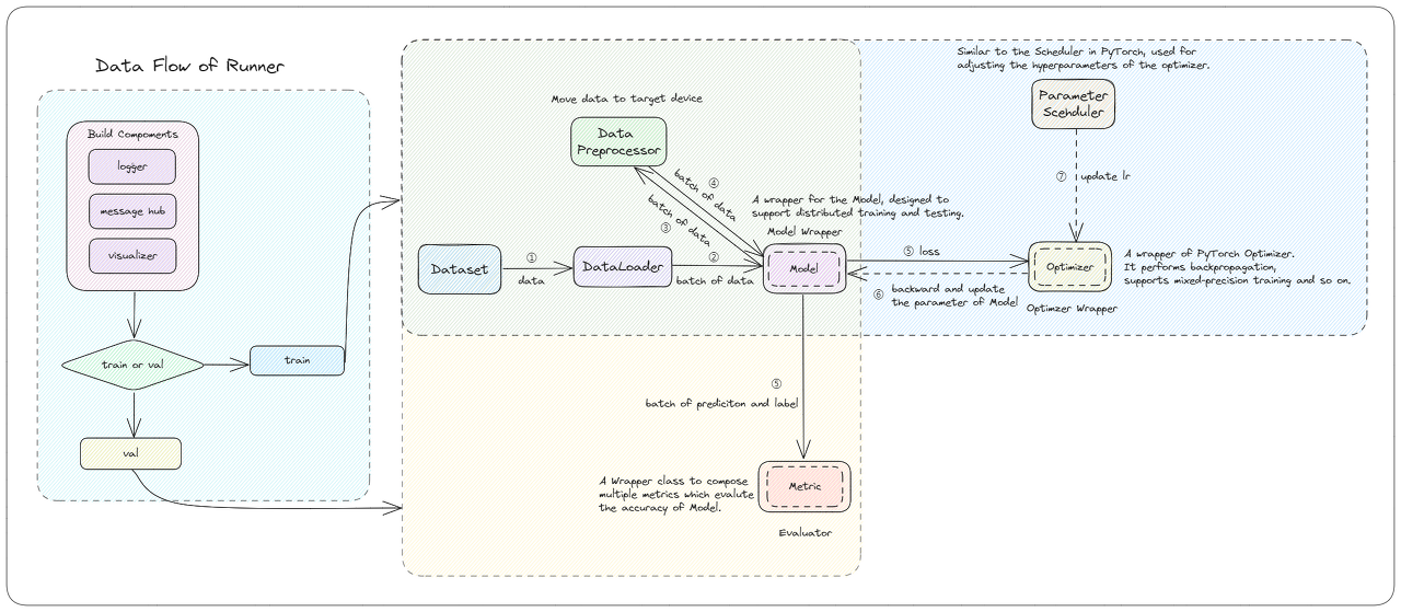 - Runner는 training engine의 핵심 모듈. 학습, 평가와 추론 작업을 책임지고 이 과정중 요구되는 다양한 component들을 관리함.