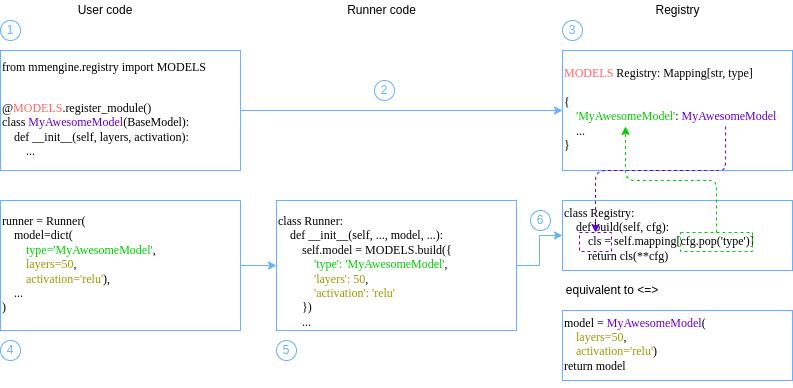 - 인자는 dict형태로 전달됨. MMEgine's Style of runner construction(manual construction / contruction via registry)